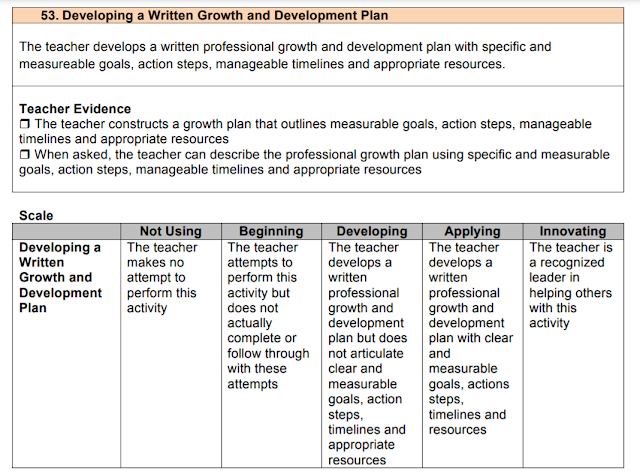 The next response in your goal setting sheet will score element #54: Monitoring Progress Relative to the Professional Growth and Development Plan. Here is a copy of the desired effect, teacher evidence, and rubric that goes with element #54. This is another of your non-observable elements that will be scored this year.
